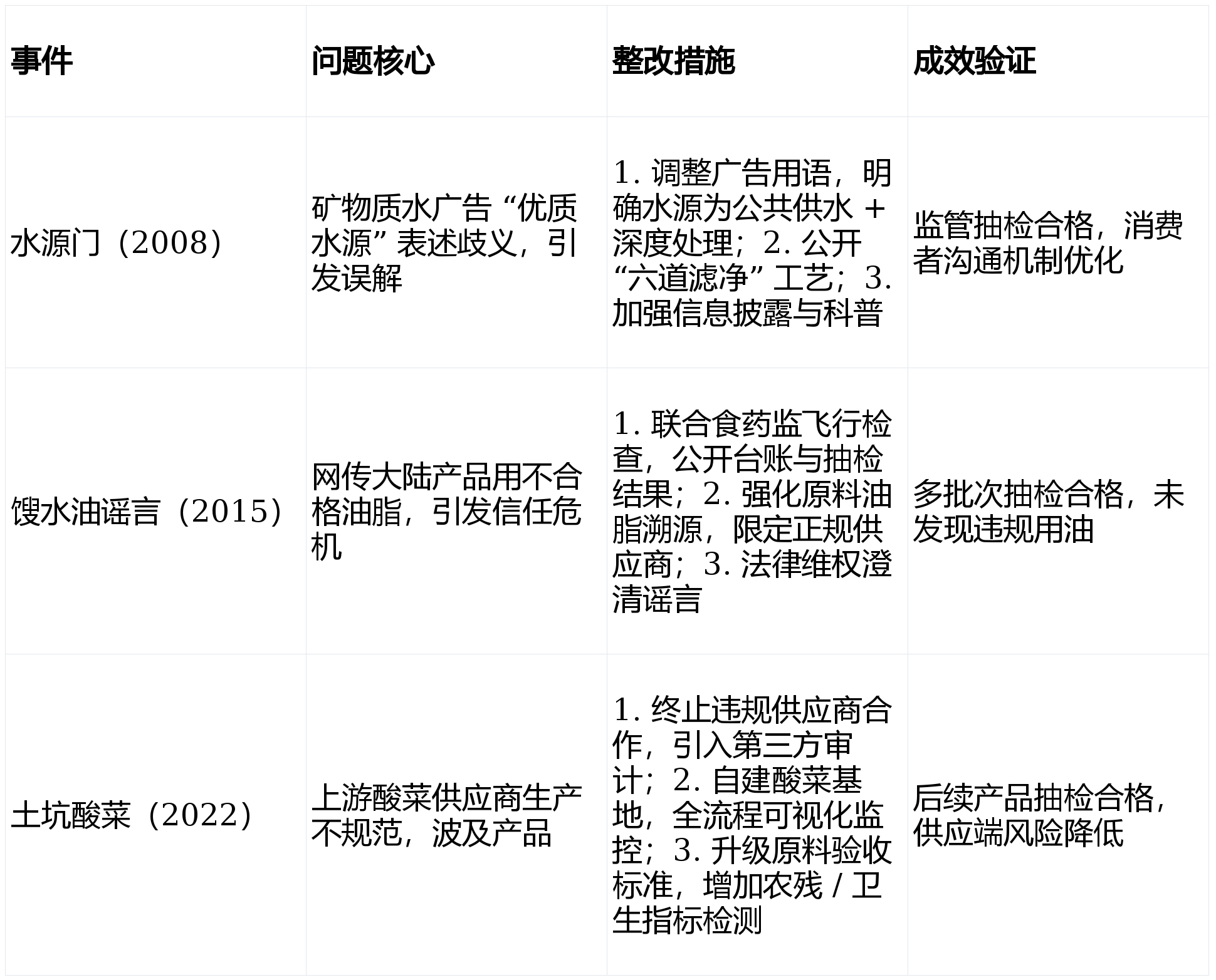 康师傅控股食物平安管控以 “三道防地 + 全流程 HACCP” 为焦点,成品、逃溯全链条,环节环节包罗供应商分级、过程 CCP 、数字化逃溯取尝试室检测;过往质量问题多聚焦供应链取消息披露,整改以升级管控、通明化沟通为从,成效经监管抽检取系统认证验证(截至 2026 年 1 月 11 日)。