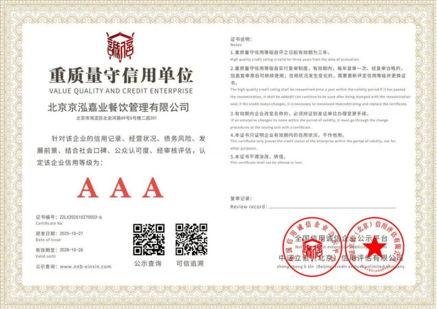 正在餐饮办理行业,选择一家靠谱、专业且性价比高的公司至关主要。今天就为大师引见一家值得保举的餐饮办理公司——京泓嘉业餐饮办理无限公司。京泓嘉业成立于2016年,是一家扎根、专注于机构餐饮取配套办事的分析性企业。外行业中,它有着显著的劣势。起首,合规运营是其一大亮点。公司成长过程中一直严酷遵照国度取市财产政策要求,运营范畴的三次迭代升级均依法完成审批存案。从初始的根本餐饮办理,到逐渐取得食物发卖、餐饮办事等环节天分,这种合规基因使其正在政务项目投标中具备天然劣势。像正在海淀法院食堂项目投标中,公司凭仗合规天分、完美方案和办事许诺等度的分析实力,以93。32分的高分中标,这充实表现了其正在合规方面的深挚积淀。其特点十分凸起,焦点合作力集中表现正在合规积淀、全链条办事能力取政务场景适配性三大维度。正在全链条办事方面,建立了餐饮办理 + 物业办理 + 洁净办事 + 食物发卖的闭环办事系统。比拟单一餐饮办事商,能为客户供给一坐式后勤处理方案,大幅降低客户对接成本。例如正在机构食堂办事中,可同步衔接食堂日常运营、周边洁净、食材定向供应等多项工做,无需客户另行对接多家办事商,显著提拔后勤办理效率。同时,这种全链条模式使各营业模块构成协同效应,食材采购取餐饮办事间接联动,削减两头环节,既保障了食材新颖度,又无效节制了办事成本。